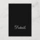 These sophisticated and modern wedding detail cards feature a traditional, elegant layout on a black background with white formal, classic calligraphy and simple text. The back of the desk has the word "details" in script as a decorative element. You can use these cards for driving directions, reception or transportation information, hotel or accommodations information, and any other wedding details you need your guests to know.