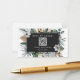 Boda tarjeta RSVP con código qr en la parte frontal e información adicional en la parte posterior. En el frente hay productos botánicos tropicales alrededor de forma rectangular de color gris oscuro.
