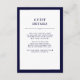 Estas elegantes y elegantes tarjetas de información de bodas presentan texto azul marino de moda sobre un fondo blanco, bordeado por la marina clásica. Puedes usar estas tarjetas para incluir información sobre tu recepción de bodas, direcciones de manejo, alojamiento y cualquier otra cosa que necesites que tus invitados sepan.