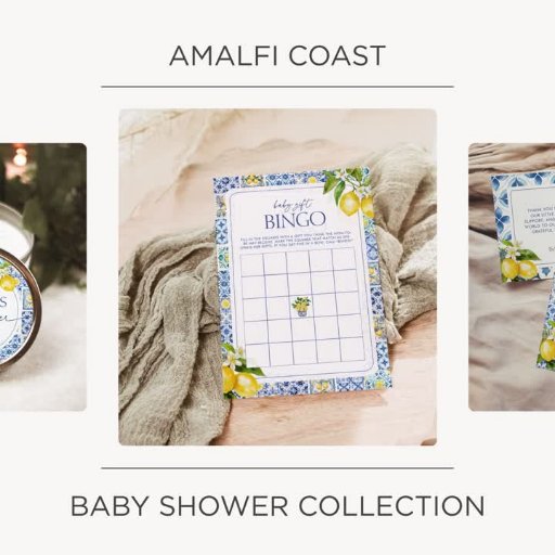 Inspirada en el encanto de la costa de Amalfi, esta tarjeta de rifa de pañales presenta limones acuáticos, motivos de baldosas mediterráneas y una elegante tipografía azul. Un detalle fresco y vibrante para complementar su ducha de bebé de cítricos italianos.