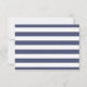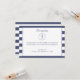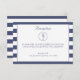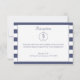 Esta tarjeta de respuesta de boda cuenta con un fondo a rayas azules y blancas. Un caballito de mar azul rodeado de puntos azules adorna la parte superior de la tarjeta. Se proporcionan áreas de plantilla para que agregues los detalles de tu recepción en una fuente decorativa azul oscuro.