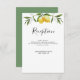 Esta tarjeta de información de recepción tiene un tema verde de verano con limones acuarela y follaje verde. Los colores y el texto se pueden editar.