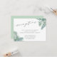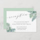 Utilice estas elegantes tarjetas de recepción para su boda de verano, destino o playa. El diseño elegante y veraniego presenta hojas de palmera tropical en acuarela verde, con los detalles de la recepción de su boda en una mezcla elegante de tipografía caligráfica, serif y cursiva. Las tarjetas se revierten a un verde mar pastel sólido para un look tropical chic.