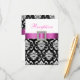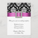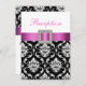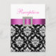 Tarjetas de recepción de boda de damasco negro y blanco elegantes con una impresión fotográfica de una cinta de satén rosa, broche cuadrado con impresión fotográfica de diamantes blancos. Gráfico de damasco con licencia de Elke Clarke. Personalice con los detalles de su recepción de boda. Perfecto como tarjeta de inclusión en sus invitaciones de boda para informar a sus invitados sobre todos los detalles de su recepción de boda.