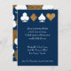 Esta tarjeta de información adicional para invitaciones de boda es perfecta para una celebración en Las Vegas, una fiesta posterior o recepción y cuenta con brillo dorado falso y símbolos de palos de cartas blancos sobre un fondo azul marino con texto totalmente personalizado. Boda elegante o un simple escape, todo lo que necesitas es amor y uno o dos testigos.