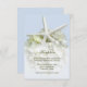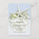 Tarjeta de inclusión de recepción de boda en jardín junto al mar. Gran estrella de mar blanca y flor de hortensia blanca sobre azul claro para combinar con el conjunto. Incluya el lugar y la hora de la recepción y la información adicional que sea necesaria en pequeñas tarjetas de 3x5.
