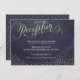 Diseño de caligrafía con letras doradas y confeti de puntos dorados sobre fondo acuarela de cielo nocturno azul marino oscuro, efecto de brillo metálico dorado falso, moderno, chic, limpio y elegante, perfecto para boda vintage o boda de invierno por la noche. Personaliza tu propia tarjeta de recepción para tu conjunto de invitaciones de boda. Ver todas las piezas coincidentes en esta colección de caligrafía con brillo dorado para noche glamurosa abajo.