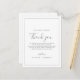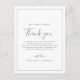 Esta minimalista tarjeta de recepción de agradecimiento plateado es perfecta para un boda sencillo. El moderno diseño romántico presenta una tipografía clásica de color gris plateado y blanco, acompañada de una caligrafía rústica y elegante con un estilo de letra a mano vintage. Personalizable de cualquier color. Mantenga el diseño simple y elegante, tal como está, o lo personaliza añadiendo sus propios gráficos y obras de arte. Coloque estas tarjetas en la mesa de cada uno de sus invitados en la recepción de su boda. Personaliza la tarjeta con tus nombres y un mensaje especial de agradecimiento.