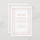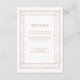 Estas glamorosas tarjetas de información de los bodas presentan un giro moderno en la decoración clásica del arte. Un marco geométrico y ornamentado con un toque de oro falso rosa decoran un elegante fondo blanco para un aspecto de boda vintage y dramático. Puede utilizar estas tarjetas para obtener información sobre la dirección, recepción o transporte, información sobre hoteles o alojamientos, y cualquier otra información sobre bodas que necesite conocer a sus clientes.