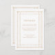 Estas glamorosas tarjetas de información de los bodas presentan un giro moderno en la decoración clásica del arte. Un marco geométrico y ornamental adornado con un aspecto de oro falso adornan un elegante fondo blanco para un aspecto de boda vintage y dramático. Puede utilizar estas tarjetas para obtener información sobre la dirección, recepción o transporte, información sobre hoteles o alojamientos, y cualquier otra información sobre bodas que necesite conocer a sus clientes.