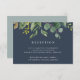 Diseñada para coordinar con nuestra colección de bodas Bosque de Eucalipto, esta tarjeta de recepción botánica exuberante presenta un ramo de hojas de acuarela y follaje de eucalipto verde, coronando los detalles de su recepción, horario y dirección, en blanco sobre un fondo azul humo marino.