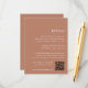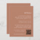Esta pequeña tarjeta de detalles es una tarjeta de recinto para todas las invitaciones a la boda y proporciona tres campos de texto personalizado para los detalles del boda, el sitio web y un código QR para las confirmaciones de asistencia o información adicional. Un diseño sencillo basado en la tipografía con un toque minimalista, con letras blancas clásicas sobre un fondo de arcilla del desierto.