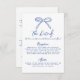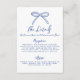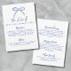 Tarjeta de detalles de boda azules caprichosos dibujados a mano. Esta tarjeta de detalles de boda presenta un diseño simple y minimalista en azul suave y blanco, con un delicado lazo dibujado a mano en la parte superior. El diseño frontal es limpio y elegante, utilizando una mezcla de letra manuscrita y fuentes manuscritas simples para crear un ambiente sofisticado y accesible.