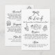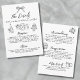Tarjeta de detalles de boda caprichosos y caprichosos dibujados a mano. Esta divertida y caprichosa tarjeta de detalles de boda presenta un diseño juguetón con un lazo dibujado a mano en la parte superior, rodeado de pequeñas ilustraciones lindas como una copa de champán, cubiertos para cenar, pastel de bodas, bola de discoteca perfecta para fiestas, coche recién casado y anillos de boda. Estos encantadores acentos traen un ambiente ligero a la tarjeta.