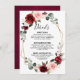 Tarjeta de detalles de boda floral temática de vino de borgoña rosa polvoriento pizarra con elegante ramo de borgoña, vino, azul polvoriento, rosado, rosas y capullos de flor de peonía y hojas de eucalipto verde polvoriento y marco geométrico neutro con brillo falso rojo. Por favor, contácteme para cualquier ayuda en personalización o si necesita cualquier otro producto con este diseño