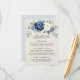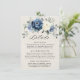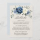 Tarjeta de detalles de boda con flores en azul polvo con un ramo elegante de azul marino, azul real, blanco, dorado, champán marfil, rosa desmayado y capullos de ranunculus y hojas de eucalipto verde salvia y ramo de acuarela elegante. Por favor, contácteme para cualquier ayuda en personalización o si necesita cualquier otro producto con este diseño.