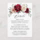 Tarjeta de detalles de boda con tema floral elegante y terrenal en rojo Burdeos, marfil champán con ramo elegante de rosas Burdeos, peonías de color marfil champán y hojas de eucalipto verde salvia. Por favor, contácteme para cualquier ayuda en personalización o si necesita cualquier otro producto con este diseño.