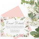 Un elegante ramo floral de peonías rosadas crea el borde superior de esta encantadora tarjeta de detalles de boda de primavera. Las ramitas de hojas de salvia que decoran en medio de la variedad de flores de durazno añaden a la elegancia. El fondo de acuarela rosada de esta tarjeta le da un toque final clásico y único.