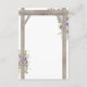 Tarjetas de información de boda bonitas con un fondo blanco elegante y chic que se puede cambiar a cualquier color, una exhibición floral de acuarela morada y lavanda en un arco de boda de madera rústica, un corazón tallado con las iniciales de la pareja y una plantilla de detalles de boda.