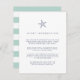 Diseñada para coordinar con nuestra colección de boda náutica de mezcla y combinación, esta tarjeta de información para invitados con estilo costero en menta y azul marino presenta letras en azul marino acentuadas con una pequeña ilustración de una estrella de mar de estilo vintage en la parte superior. Reemplace el texto de muestra con los detalles clave de su celebración de boda. Las tarjetas se revierten a franjas horizontales anchas en verde pálido espuma de mar y blanco.