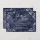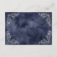 Esta elegante tarjeta de gabinete de detalles de boda inspirada en vintage presenta el texto en escritura gris plateado pálido y fuentes serif, enmarcada por un delicado motivo follaje plateado vintage en cuatro esquinas sobre un fondo acuático azul marino. El marco y el fondo de la acuarela se repiten al revés.