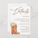 Comparte toda la información importante con estilo con esta tarjeta de detalles de la despedida de soltera con estilo Rustic Country que presenta botas de vaquera vintage, un sombrero de vaquero, acentos florales y un fondo de textura de madera. Perfecta para despedidas de soltera con temática western, de granero o campestre, esta tarjeta insertable es ideal para incluir información de registro, direcciones, detalles de alojamiento o notas especiales. Personalízala para que se adapte a tu evento y brinda a tus invitados todo lo que necesitan saber, envuelto en un encanto rústico.