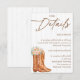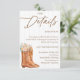 Comparte toda la información importante con estilo con esta tarjeta de detalles de la despedida de soltera Rustic Country que presenta botas de vaquera vintage, un sombrero de vaquero, acentos florales y un fondo de textura de madera. Perfecta para despedidas de soltera con temática western, de granero o campestre, esta tarjeta insertable es ideal para incluir información del registro, direcciones, detalles de alojamiento o notas especiales. Personalízala para que se ajuste a tu evento y brinda a tus invitados todo lo que necesitan saber, envuelto en un encanto rústico.