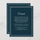 Esta sencilla y elegante tarjeta de alojamiento para bodas en azul marino está diseñada para proporcionar a sus invitados información sobre el día de su boda. Se incluye una plantilla de texto de ejemplo para personalizar con cualquier información que desee adjuntar a sus invitaciones de boda. Utilícelo para proporcionar información de alojamiento de hotel, su registro de bodas o sitio web, reuniones especiales, información de transporte, direcciones de conducción, etc. También puede cambiar el color de fondo marino de esta tarjeta de gabinete con cualquier otro color.