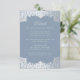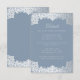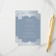 Esta elegante tarjeta de detalles de boda, con un aire vintage, tiene elegantes decoraciones barrocas de imitación de plata en los bordes superior e inferior sobre un polvoriento fondo azul. El título Detalles está escrito en un guión caligráfico elegante. Todo el texto tiene un color gris similar a las decoraciones de los bordes. Se pueden incluir detalles sobre la recepción, los alojamientos, las direcciones, el sitio web del boda y más. Si quieres tarjetas de alojamiento diferentes para recepción, alojamiento, direcciones, etc., puedes cambiar el título en consecuencia. Las elegantes decoraciones provienen de una portada de libros franceses de finales del siglo XIX, ahora de dominio público, de Nicolas Denis Derome (1731-1790), conocida como Derome le Jeune, para un libro titulado "Gaspar Pergam Epistol".