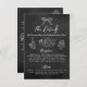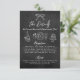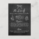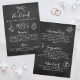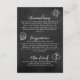 Tarjeta De Alojamiento Con Detalles De Boda De Carácter Cálido, De Estilo Chalkboard. Esta divertida y divertida carta cuenta con un fondo negro de pizarra con ilustraciones blancos dibujados a mano que parecen auténticos bocetos de tiza. En la parte superior hay un arco caprichoso, rodeado de adorables elementos como una copa de champán, anillos de bodas, cubiertos, una torta en niveles, una bola de disco y un coche "Just Married", lo que añade un toque alegre y alegre. La disposición frontal combina el guión a mano con el sencillo grabado en tiza, lo que le da un aspecto casual pero elegante. Hay mucho espacio para incluir detalles de recepción, código de vestimenta, alojamiento, información de transporte e incluso tu sitio web de bodas. El diseño completo del personalizable le permite ajustar el texto para que se ajuste a sus necesidades y estilo de evento. Perfecto para las parejas que desean compartir su información boda de una forma única y creativa, esta tarjeta impresa añade encanto y personalidad a su suite, manteniendo las cosas claras y fáciles para sus huéspedes.