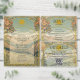 Diseño romántico vintage con elementos de Art Nouveau y Art Deco con un fondo de naturaleza caprichosa con montañas, colinas y árboles, en tonos mudos de verde y melocotón, con elegantes fuentes vintage y marco falso de color dorado con un sol.