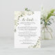 Esta hermosa tarjeta de alojamiento está diseñada para proporcionar a sus huéspedes información adicional sobre la recepción, alojamiento, organización de viajes, registro, sitio web, direcciones, o cualquier otra información que sus huéspedes puedan necesitar. Cuenta con un bonito diseño rústico de moda boho con caligrafía de escritura de encaje y rosas acuáticos pintados a mano y flores en tonos marfil, crema o blanco, con brotes o hojas de eucalipto y vegetación en el jardín.