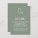 Adjunte esta tarjeta de detalles con sus invitaciones de boda para proporcionar a los huéspedes información de alojamiento, direcciones, ubicación de recepción y más. El sencillo diseño minimalista incluye un amperador y un monograma en la parte superior, con fondo verde sabio. Encuentra productos coincidentes en la colección, o contacta conmigo a través de la charla de Zazzle para obtener productos adicionales u otros colores.