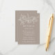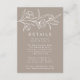 Elegante boda floral detalles de tarjetas con flores blancas esbozadas y hojas cerca de la parte superior del diseño con un fondo de taupe. Personalice las tarjetas de detalles botánicos del boda con los detalles de su boda en letras blancas clásicas. Diseñado para coordinar con nuestra colección de bodas florales esbozados.