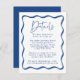 Completa tu suite boda con nuestra tarjeta de detalles de boda Wavy Frame Moderno. Con el mismo diseño retro que nuestra colección de invitaciones, esta tarjeta incluye un borde ondulado azul que rodea los detalles importantes de su boda, como detalles del lugar de boda, alojamiento del hotel, direcciones y sitio web de bodas.