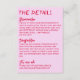 Detalles del boda, sencillos y elegantes, retro y colorido. Con un fondo rosa cálido y funky y magenta rojo negrita y diseño de texto escrito a mano . Toda la información es personalizable como sitio web, transporte, alojamiento . Acompáñalo con otros productos de esta elegante suite boda retro hecha a mano.