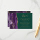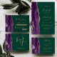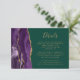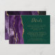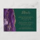 El borde izquierdo de esta elegante y moderna tarjeta de gabinete de detalles bodas cuenta con un borde de agujeros color morado recortado con falso purpurina de oro. El título aparece en forma de escritura a mano, con el texto de personalizable debajo en una fuente de copperplate de color dorado sobre un fondo verde esmeralda. El reverso presenta un diseño de agate morado y dorado a juego.