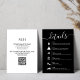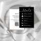 Esta tarjeta de gabinete de línea de tiempo de detalles simples con detalles bodas con un código QR escaneado y una línea de tiempo simple, con un estilo negro y blanco,= y minimalista, guión de caligrafía, con detalles de recepción y un elegante monograma en el reverso.