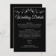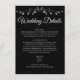 Esta hermosa tarjeta de alojamiento está diseñada para proporcionar a sus huéspedes información adicional sobre la recepción, alojamiento, organización de viajes, registro, sitio web, direcciones, o cualquier otro detalle adicional que sus huéspedes puedan necesitar. Presenta un diseño sencillo pero elegante con texto blanco sobre fondo negro y un Relieve metalizado floral plateado.
