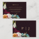 Esta elegante tarjeta de gabinete de detalles de boda personalizada incluye caligrafía de escritura de oro falsa sobre un fondo burdeos oscuro con flores rosa, borgoña y melocotón con eucalipto. Personalice los datos de su boda. La parte posterior de la tarjeta tiene su primer nombre iniciales monograma en tipografía falsa de oro bordeada por flores. ¡Mis mejores deseos para su boda y matrimonio! Diseñado por la artista ©Susan Coffey.