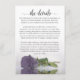 Esta hermosa tarjeta de gabinete boda está diseñada para darle espacio adicional para cualquier información que sus huéspedes puedan necesitar, incluyendo sitio web, registro, recepción, viajes, alojamiento o cualquier otro detalle. La tarjeta presenta un diseño magnífico con un solo rosa reflectante de lila, lavanda o polvoriento color púrpura y un título de caligrafía de escritura de encaje que dice "los detalles". La parte posterior es de un color morado claro y profundo.