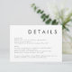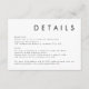 Esta es una elegante y moderna tarjeta de detalles de boda con un diseño minimalista. Todos los colores son editables. // Para encontrar diseños coincidentes, busque "HARLOW" en la tienda Sincerely By Nicole Zazzle. * Si te gusta este diseño pero no lo ves disponible para algo que estás buscando, por favor contacta conmigo en cualquier momento :)