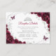 Tarjetas de detalles de recepción de Quinceañera con flores de burgundy, plata y blanco. Características, letra de script, mariposas de plata, rosas de acuarela y tiara. Perfecto para una celebración de glamour de princesa elegante. Personalice con sus propios detalles.