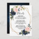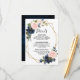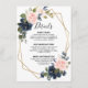 Tarjeta de detalles de invitación de boda floral geométrica azul marino oscuro con un elegante ramo de flores de azul marino, azul real, blanco, rosa salmón y hojas de eucalipto verde salvia y marco geométrico neutro con brillo elegante. Por favor, contácteme para cualquier ayuda en personalización o si necesita cualquier otro producto con este diseño.