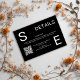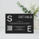 Este sencillo boda de código QR minimalista detalles de la tarjeta de gabinete incluye un elegante fondo negro con caligrafía blanca moderna e iniciales/monograma.