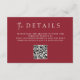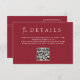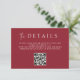 Una sencilla y elegante tarjeta de gabinete Detalles con estilo contemporáneo y un sofisticado estilo en rojo arándano con texto de marfil. Cuenta con una atractiva disposición minimalista, elegante tipografía, un código QR que personalizar con su sitio web boda para conectar a los huéspedes con todos los detalles y RSVP. Además, la parte posterior de la tarjeta tiene una plantilla para personalizar con las iniciales del monograma de la novia y el novio y establece el tono perfecto para su celebración. Personalizar con la información detallada de su boda requerida y las iniciales del monograma.