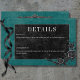 Transportar a sus huéspedes a un mundo de oscuridad y elegancia encantadora con nuestra vintage tarjeta de detalles de boda gótico. El fondo verde azulado profundo y envejecido prepara el terreno para un contraste sorprendente, a medida que el texto en negrita blanco emerge de intrincados cuadros de texto en negro. En el pináculo de esta invitación, un borde gótico tridimensional adornado con un cuervo negro real captura la esencia del misterio y el romance. La parte trasera está adornada con dos viñas entrelazadas de rosas negros formando sutilmente un corazón alrededor de dos cuervos abrazadores, lo que añade un toque de encanto dramático. Desate la magia y marca el tono para un día de boda inolvidable. Esta tarjeta es parte de la suite Boda Verde azulada Raven negro y Rosas negros creada por Simply Farmhouse Press.