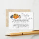 Esta pequeña tarjeta contiene tres adorables calabazas con estampado naranja, negro y blanco y leopardo. La calabaza naranja se acentúa con girasoles amarillos bonitos. "Display Shower" en una tipografía cursiva manuscrita aparece en la parte superior junto con un poema dulce. La parte posterior de la tarjeta es una copia impresa de una bala y permite que haya mucho espacio para añadir cualquier detalle o texto adicional.