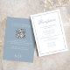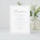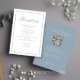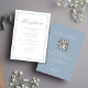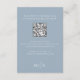 La elegante carta de la recepción da una impresión duradera, con un tema polvoriento de color azul y una elegante y sofisticada paleta. Diseñada con un guión elegante de caligrafía y una tipografía clásica formal, esta tarjeta combina con elegancia la elegancia y la funcionalidad moderna. Incluye una sección de detalles del boda de código QR, que guía a los huéspedes a su sitio web boda RSVP y opciones modernas de respuesta en línea. Comparte habitaciones sencillas y todos los detalles de información esencial en Internet en un diseño impecable y refinado.