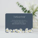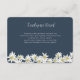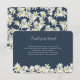 Completa tu suite de despedida de soltera con esta elegante tarjeta de inclusión Edelweiss. Sobre un dramático fondo azul marino, este diseño presenta flores Edelweiss dibujadas a mano para un toque atemporal e inspirado en la naturaleza. Totalmente personalizable y fácil de usar, esta tarjeta puede utilizarse para detalles del registro de regalos, información del fondo para la luna de miel, solicitudes de recetas, instrucciones para eventos especiales o cualquier otro mensaje personalizado para tus invitados.